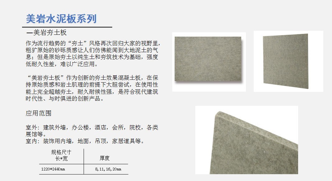 美巖夯土板,作為創(chuàng)新的夯土效果混凝土板,粗獷原始的砂礫質感讓人們仿佛能聞到大地泥土的氣息,在保持原始質感和巖石肌理的前提下大膽嘗試,在使用性能上完全超越原始夯土,耐久耐候性強,是符合現(xiàn)在建筑時代性、與時俱進的創(chuàng)新產品。